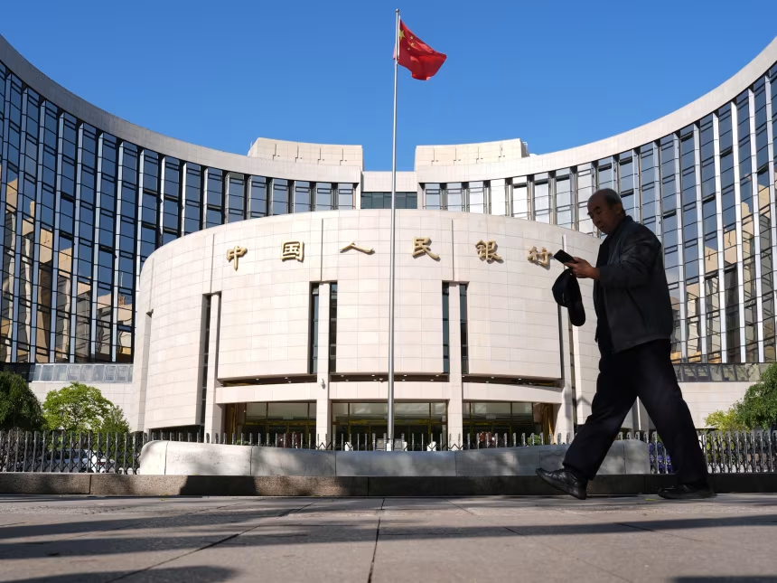 တရုတ်ဗဟိုဘဏ်ကြီးရှေ့မှလူတယောက်ဖြတ်လျှောက်သွားနေပုံ (ဓါတ်ပုံ)