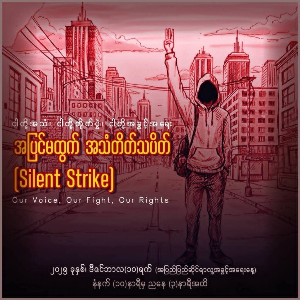 “ Our Voice, Our Fight, Our Rights” ဆိုတဲ့ ဒီတစ်ခါ အသံတိတ်သပိတ် ဆောင်ပုဒ်အတိုင်း ကျနော်တို့ အခွင့်အရေးတွေအတွက် ကျနော်တို့ အသံတွေကို တိတ်ကာ ဟစ်ကြွေးလို့ တိုက်ပွဲဝင်ကြပါမယ်။ အသံတိတ်သပိတ် ကျင်းပမယ့်နေ့ရက်ကို ဒီဇင်ဘာလ (၁၀)ရက်နေ့ အပြည်ပြည်ဆိုင်ရာ လူ့အခွင့်အရေးနေ့အနေနဲ့ သတ်မှတ်ထားပြီး သပိတ်ပြုလုပ်မယ့်အချိန်ကိုတော့ ရုံးတက်ရုံးဆင်း၊ စျေးသွားစျေးလာအချိန်ကာလတွေနဲ့ ဝေးကွာအောင် မနက် (၁၀)နာရီကနေ ညနေ (၃)နာရီ သတ်မှတ်ထားပါတယ်” လို့ ဆက်ပြောပါတယ်။
