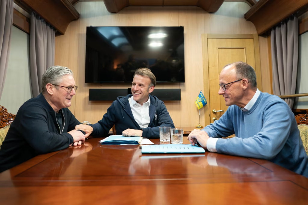 ဗြိတိန်ဝန်ကြီးချုပ် ကီယာစတာမာ (Keir Starmer) ၊ ပြင်သစ်သမ္မတ အီမန်နျူရယ်မက်ခရွန် (Emmanuel Macron) နှင့် ဂျာမနီဝန်ကြီးချုပ် ဖရက်ဒရစ်ချ် မာ့ဇ်(Friedrich Merz)