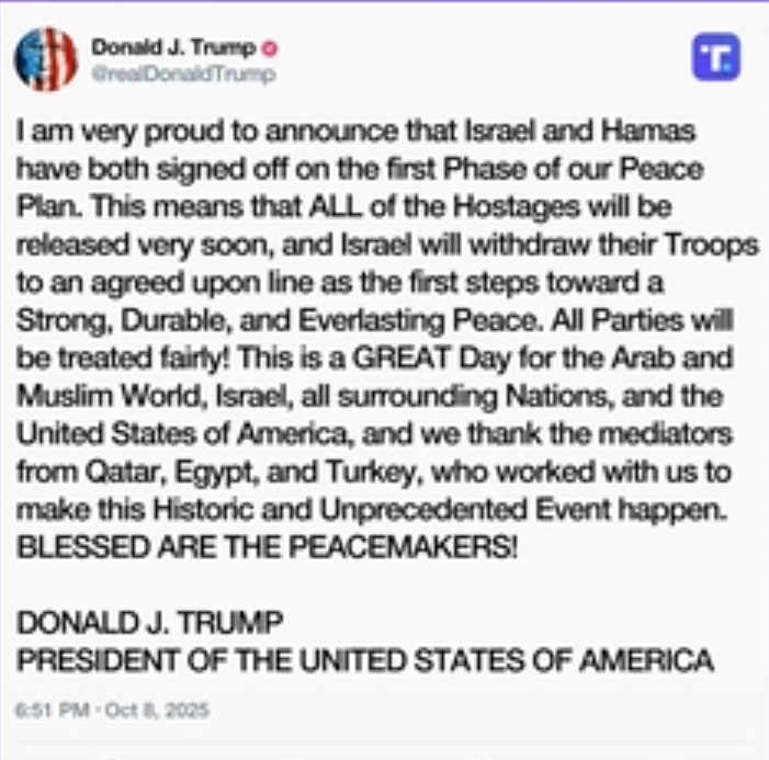 • အမေရိကန်သမ္မတ ဒေါ်နယ်ထရန့် (Donald Trump) က ပဋိပက္ခကို အဆုံးသတ်ရန် ရည်ရွယ်သည့် ငြိမ်းချမ်းရေးအစီအစဉ်၏ “ ပထမအဆင့်” ကို အစ္စရေးနှင့် ဟားမတ်စ်တို့ သဘောတူညီခဲ့ကြပြီ ဟု ကြေညာခဲ့သည်။