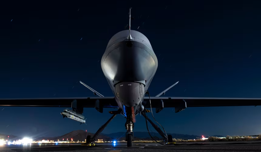 ၂၀၂၀ ခုနှစ်၊ စက်တင်ဘာလ ၃ ရက်နေ့တွင် နီဗားဒါးပြည်နယ်၊ Creech လေတပ်စခန်း၌ လက်နက်စမ်းသပ်မှုတစ်ခုအတွင်း တာဝန်ပေးအပ်ခံရသော အမေရိကန်လေတပ် MQ-9 Reaper တစ်စင်း။