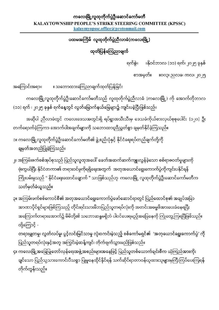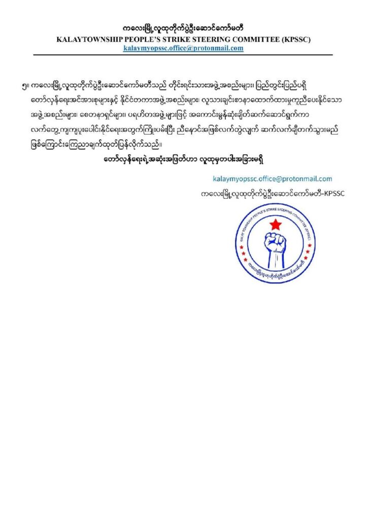 ဒါ့အပြင် ကလေးမြို့အခြေပြုတော်လှန်ရေးအဖွဲ့တွေအနေနဲ့ ပြည်သူတယောက်ချင်းစီက ယုံကြည်အားကိုးချင်တဲ့ ပြည်သူ့သားကောင်းပီသစွာ ပြုမူနေထိုင်နိုင်ဖို့ သက်ဆိုင်ရာတာဝန်ယူထားသူတွေက ကြီးကြပ်ပေးဖို့ တိုက်တွန်းထားပါတယ်။
