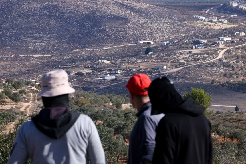 ၂၀၂၅ ခုနှစ်၊ အောက်တိုဘာလ ၁၉ ရက်နေ့တွင် သိမ်းပိုက်ခံထားရသော အနောက်ဘက်ကမ်းရှိ Turmos Ayya ရွာအနီးရှိ အစ္စရေးအခြေချနေထိုင်သူများ၏ ကင်းစခန်းများကို လူများက ကြည့်နေစဥ် ( ပုံ)။