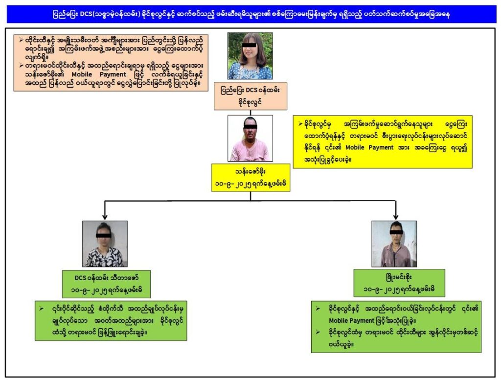 သူတို့ဟာ စစ်တပ်က ၅၀၅(က)နဲ့ အမှုဖွင့်ထားပြီး ပြည်ပကိုရောက်ရှိနေတဲ့ CDM ပညာရေးဝန်ထမ်း ခိုင်စုလွင်နဲ့ ပူးပေါင်းကာ အွန်လိုင်းကနေ ထိုင်းထီနဲ့ ကုန်ပစ္စည်း ရောင်းချပြီး PDF တွေကို ထောက်ပံ့နေတာလို့ ဖော်ပြထားပါတယ်။