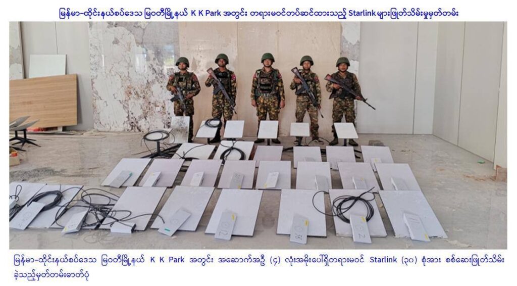 စစ်တပ်က ဝင်ရောက်စီးနင်းတဲ့အချိန် KK Park ထဲကနေ ထူးခြားလက္ခဏာမတွေ့ပေမယ့် Star Link စလောင်း အစုံ (၃၀)နဲ့ ဆက်စပ်ပစ္စည်းတွေကို သိမ်းဆည်းရမိခဲ့တယ်လို့ ဆိုပါတယ်။