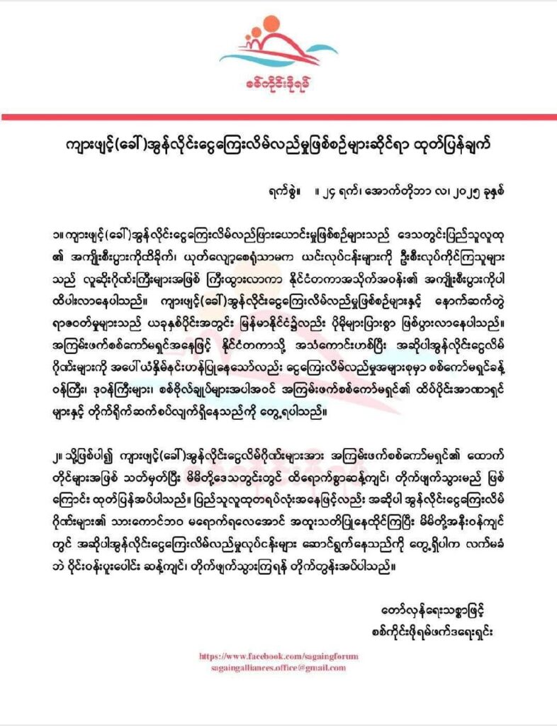 ကျားဖြန့်‌(ခေါ်)အွန်လိုင်းငွေလိမ်ဂိုဏ်းတွေကို စစ်တပ်ထောက်တိုင်တွေအနေနဲ့ တိုက်ဖျက်သွားမယ်လို့ စစ်ကိုင်းဖိုရမ်ထုတ်ပြန်
