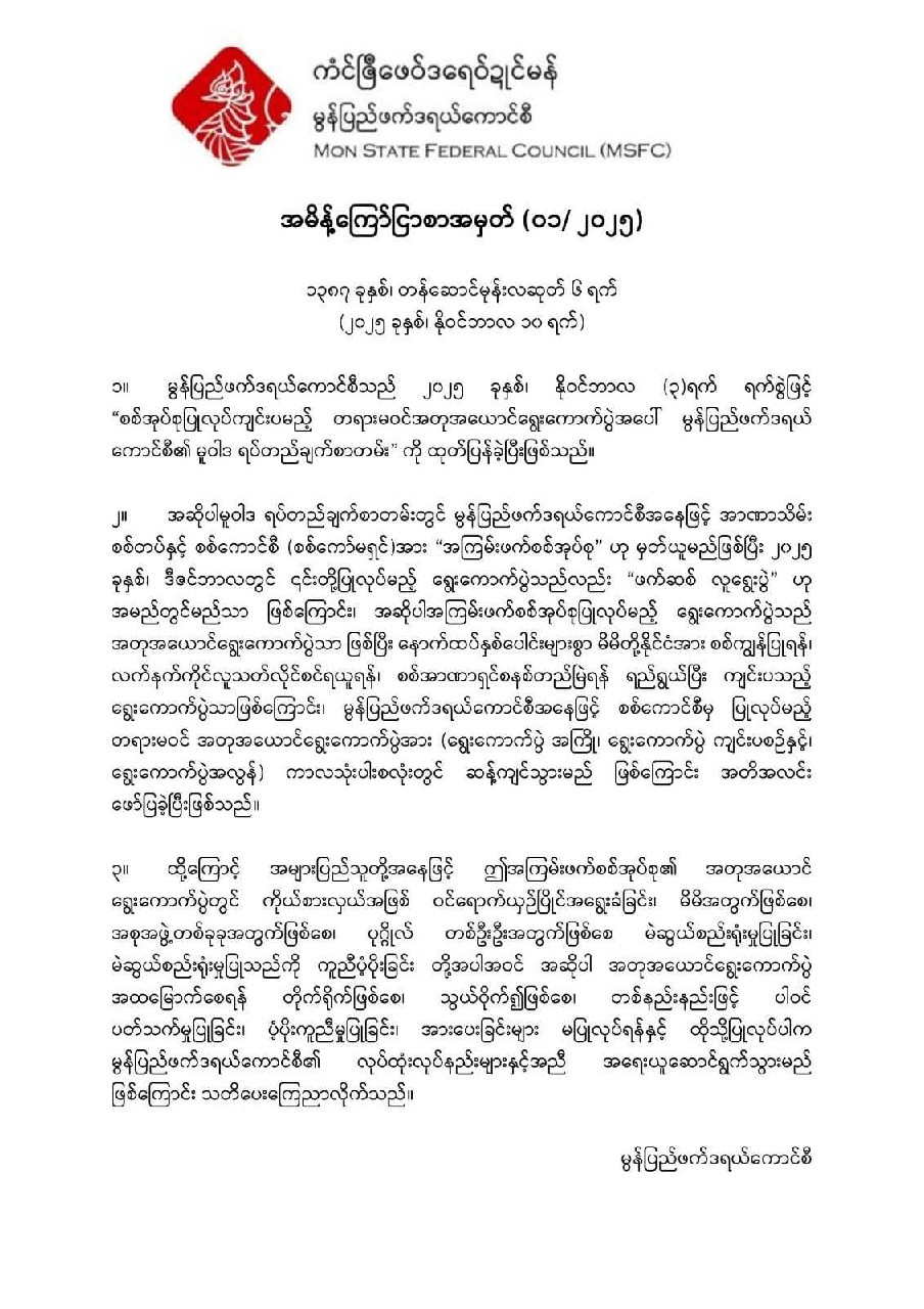 မတ်လ (၂၃)ရက်နေ့ ညနေ (၅)နာရီ (၂၀)မိနစ်အချိန်က ကျိုက်ထိုမြို့ ရန်ကုန်-မော်လမြိုင်ကားလမ်းပေါ်က စစ်ကောင်စီရဲ့ စသုံးလုံးအဖွဲ့တွေကို တိုက်ခိုက်ခဲ့တယ်လို့ မြို့နယ်ပကဖရဲ့ ဒီကနေ့မှာ ထုတ်ပြန်ထားချက်အရ သိရပါတယ်။