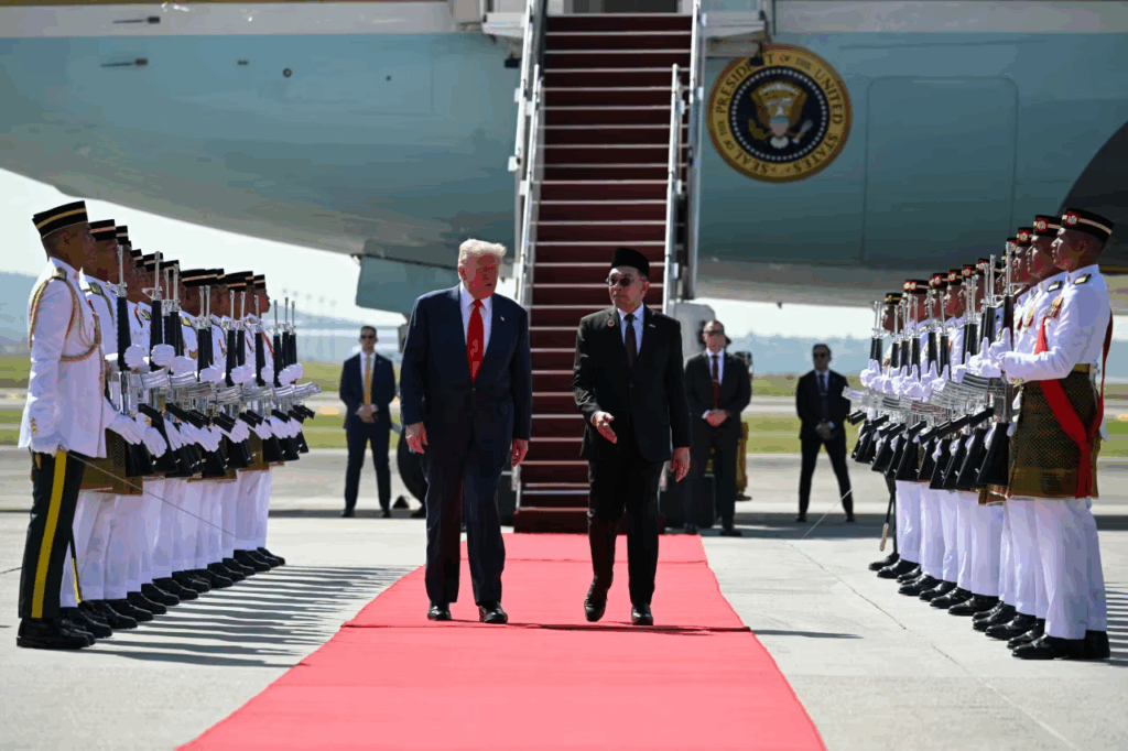 အမေရိကန်သမ္မတ ဒေါ်နယ်လ် ထရန့်ပ်သည် မလေးရှားနိုင်ငံသို့ စနေနေ့နှောင်းပိုင်း (ဒေသစံတော်ချိန်အားဖြင့် တနင်္ဂနွေနေ့ နံနက်ပိုင်း) က ရောက်ရှိလာရာတွင် ဂုဏ်သရေရှိ ပုဂ္ဂိုလ်များ၊ အကသမားများနှင့် အလံများဝှေ့ယမ်းသူများက ကြိုဆိုခဲ့ကြပါသည်။