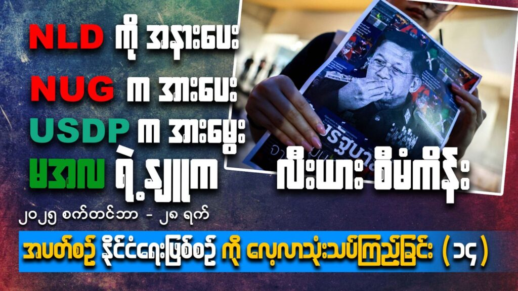 ပထမဆုံးတင်ပြမဲ့အကြောင်းကတော့ စစ်တပ်ကလူထုထောက်ခံမှုအများဆုံးရရှိနေတဲ့ NLDပါတီကို ဖျက်သိမ်းလိုက်ပြီး သူတို့ဦးစီးလုပ်မဲ့ ရွေးကောက်ပွဲမှာသူတို့ကြံဖွတ်ပါတီဒီတခါ လွတ်လွတ် ကျွတ်ကျွတ် နိုင်အောင်ပြင်ဆင်တာနဲ့အတူ စစ်ဗိုလ်ချုပ်တွေ နဲ့အရာရှိအရာခံ ၅၀၀လောက်လူဝတ်လဲပြီးပါတီနိုင်ငံရေးထဲကိုဝင်လာတာရယ်။ အစိုးရအမည်ခံထားတဲ့ NUG ဝန်ကြီးချုပ်က နိုင်ငံခြားတိုင်းပြည်တွေက မထောက်ခံပေမဲ့ အားမငယ်ကြဖို့ပြည်သူတွေကို အားပေးစကားပြောခဲ့တာကို ဆွေးနွေးကြမှာဖြစ်ပါတယ်။ မင်းအောင်လှိုင်က သူ့အားကိုး နေတဲ့ ရုရှားခေါင်းဆောင် ပူတင်ထံသွားပြီး မြန်မာနိုင်ငံမှာ နျူကလီးယား ဓါတ်အားပေး စက်ရုံအငယ်စားတခု တည်ဆောက်ဖို့ကြံစည်မှုအပေါ် အမြင်ကို ကြားကြရမှာ ဖြစ်ပါတယ်။
