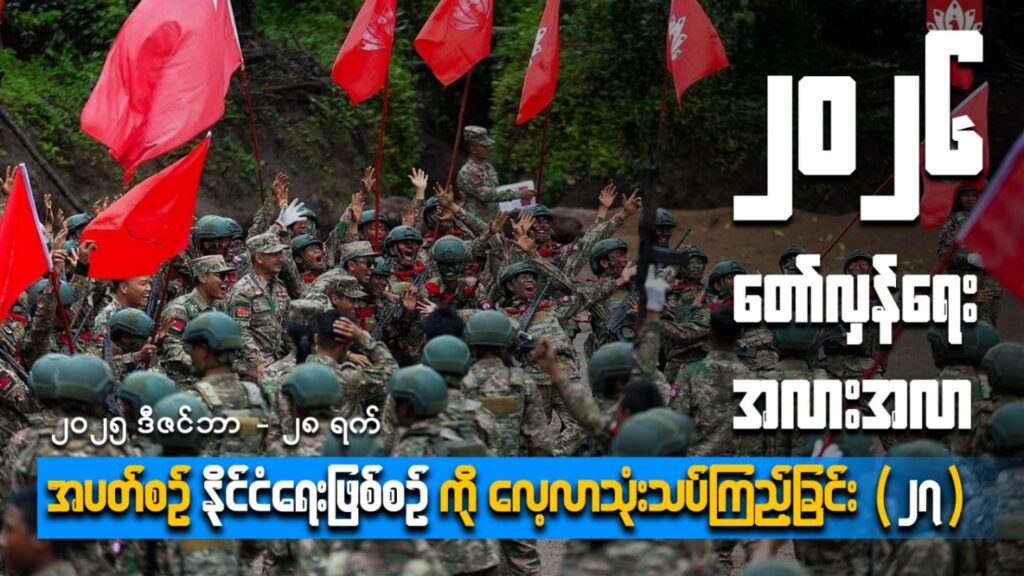 အပတ်စဥ်နိုင်ငံရေးဖြစ်စဥ်များကိုလေ့လာသုံးသပ်ကြည့်ခြင်း (၂၇) မှာ ခေတ်မျက်လုံးရဲ့ ပင်တိုင်ဆွေးနွေးတင်ဆက်သူ ဦးထွန်းအောင်ကျော်နဲ့ဦးထွန်းကြည်တို့က အခုရောက်ရှိလာတော့မဲ့နှစ်သစ် ၂၀၂၆ခုနှစ်မှာတော်လှန်ရေးအင်အားစုတွေ၊ တိုင်းရင်းသားလက်နက်ကိုင်အဖွဲ့အစည်းတွေ ဘယ်လိုရှေ့ဆက်ချီတက်ကြမယ်၊ တပ်ပေါင်းစုတွေကိုဘယ်လောက်အထိမျှော်မှန်းနိုင်မလဲ၊ ဘုံရန်သူစစ်အုပ်စုကို ဘယ်လို သေနင်္ဂဗြူဟာ တွေချမှတ်ဆောင်ရွက်နေတယ်လို့မြင်သလဲ ၊ စစ်အုပ်စုရဲ့ရွေးကောက်ပွဲ နောက်ပိုင်းသူတို့ရှင်သန်နိုင်ပါ့မလားဆိုတာတွေကို ဆွေးနွေးတင်ပြသွားမှာဖြစ်ပါတယ်။ ဒီတနင်္ဂနွေနေ့ ဒီဇင်ဘာလ ၂၈ရက် မြန်မာစံတော်ချိန်ည ၇နာရီခွဲမှာစတင်ပြီး Era’s Eye YouTube Channel ကနေLive ပြောကြမှာဖြစ်လို့ စောင့်မျှော် ကြည့်ရှုအားပေး နိုင်ကြပါတယ်။ အောက်ကလင့်ကိုကလစ်လုပ်ပြီး ကြည့်ရှုနိုင်ပါတယ်။