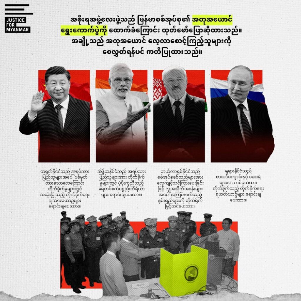 တရုတ်၊ ရုရှား၊ ဘယ်လာရုစ်နဲ့ အိန္ဒိယနိုင်ငံတို့ဟာ စစ်အုပ်စုရဲ့ ရာဇဝတ်မိတ်ဖက်နိုင်ငံတွေလို့ Justice for Myanmar(JFM)က ဒီကနေ့မှာ ထုတ်ပြန်ပြောဆိုထားတယ်လို့ သိရပါတယ်။