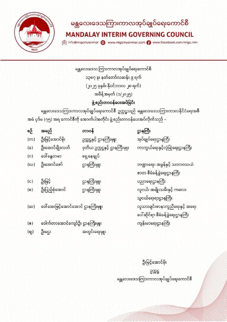 မန္တလေးဒေသကြားကာလအုပ်ချုပ်ရေးကောင်စီရဲ့ အုပ်ချုပ်ရေးဌာနကြီး ဥက္ကဋ္ဌအနေနဲ့ ဦးမြင့်အောင်မိုးနဲ့ ကာကွယ်ရေးနဲ့ လုံခြုံရေးဌာနကြီး ဒုဥက္ကဋ္ဌအနေနဲ့ ဦးအောင်မျိုးလတ်အပါအဝင် ဌာနကြီး (၈)ခုနဲ့ ဖွဲ့စည်းခဲ့တယ်လို့ သိရပါတယ်။