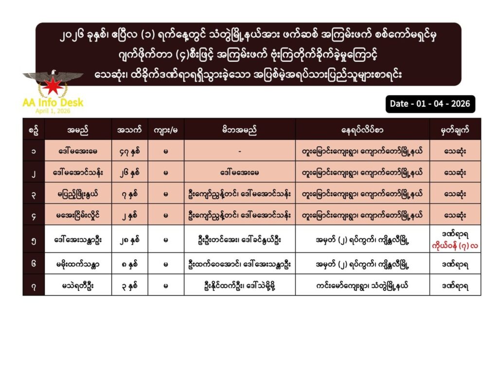 မနေ့က နေ့လယ် (၁၁)နာရီကျော်အချိန်က သံတွဲမြို့ကို လေကြောင်းဗုံးကြဲခဲ့တဲ့ဖြစ်စဉ်ထဲ ကလေးတွေအပါအဝင် မိသားစုလိုက် သေဆုံးခဲ့တယ်လို့ AA ရဲ့ ထုတ်ပြန်ထားချက်အရ သိရပါတယ်။