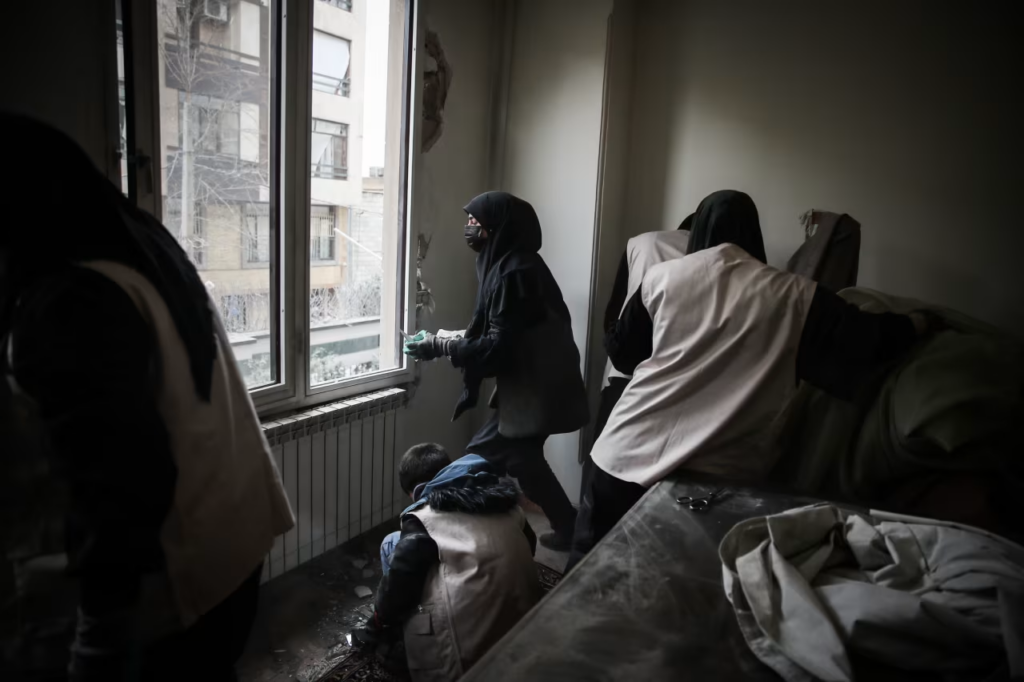 စနေနေ့က တီဟီရန်ရှိ လူနေအဆောက်အအုံတစ်ခုကို ထိမှန်ခဲ့သည့် တိုက်ခိုက်မှုအပြီးတွင် ကယ်ဆယ်ရေးသမားတစ်ဦးက ဒဏ်ရာရရှိထားသော ကောင်လေးတစ်ဦးကို ကူညီပေးနေစဉ်။ Sajad Safari/AP(ဓါတ်ပုံ)