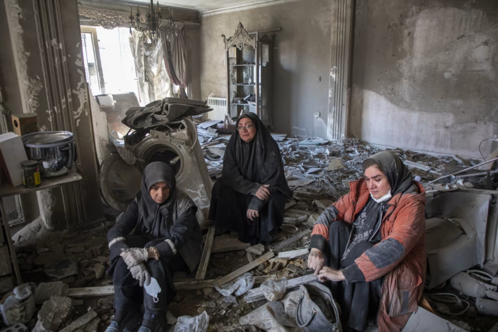 တနင်္ဂနွေနေ့က တီဟီရန်ရှိ တိုက်ခိုက်ခံရသော လူနေအဆောက်အအုံတစ်ခုအတွင်းရှိ အခန်းတစ်ခုကို အီရန်အမျိုးသမီးများ သန့်ရှင်းရေးလုပ်နေကြစဉ်။ Stringer/picture-alliance/AP(ဓါတ်ပုံ)