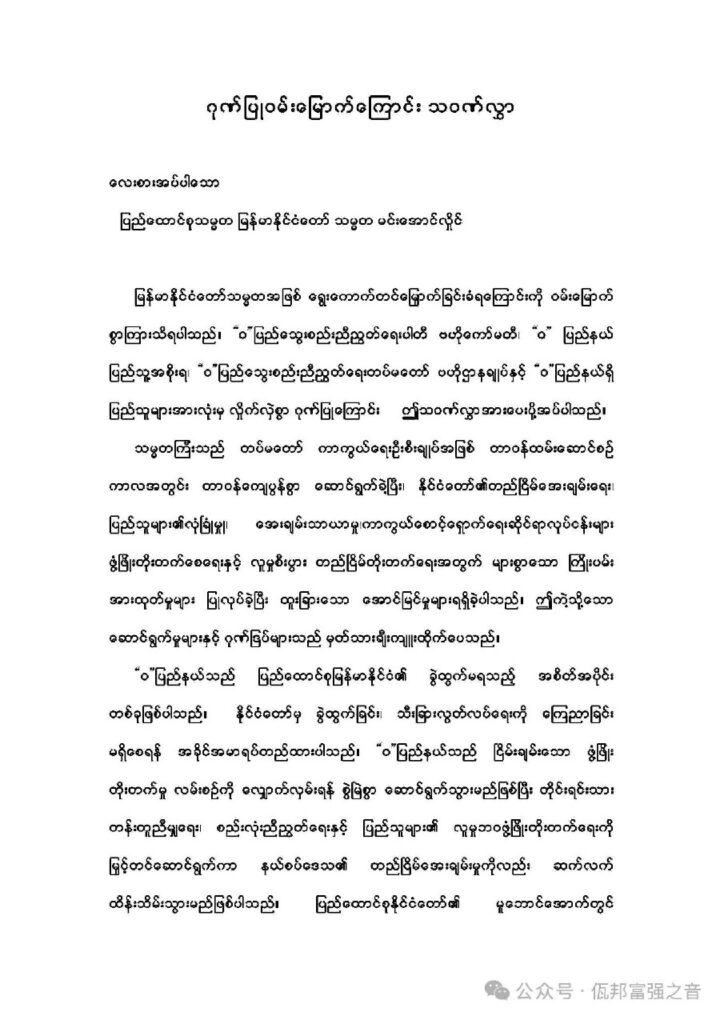 “ ဝ” ပြည်နယ်ဟာ နိုင်ငံရဲ့ ခွဲထွက်မရတဲ့ အစိတ်အပိုင်းဖြစ်ပြီး နိုင်ငံကနေ ခွဲထွက်တာ၊ သီးခြားလွတ်လပ်ဖို့ကို ကြေညာတာမရှိစေဖို့ အခိုင်အမာ ရပ်တည်ထားတယ်လို့ ဖော်ပြထားပါတယ်။