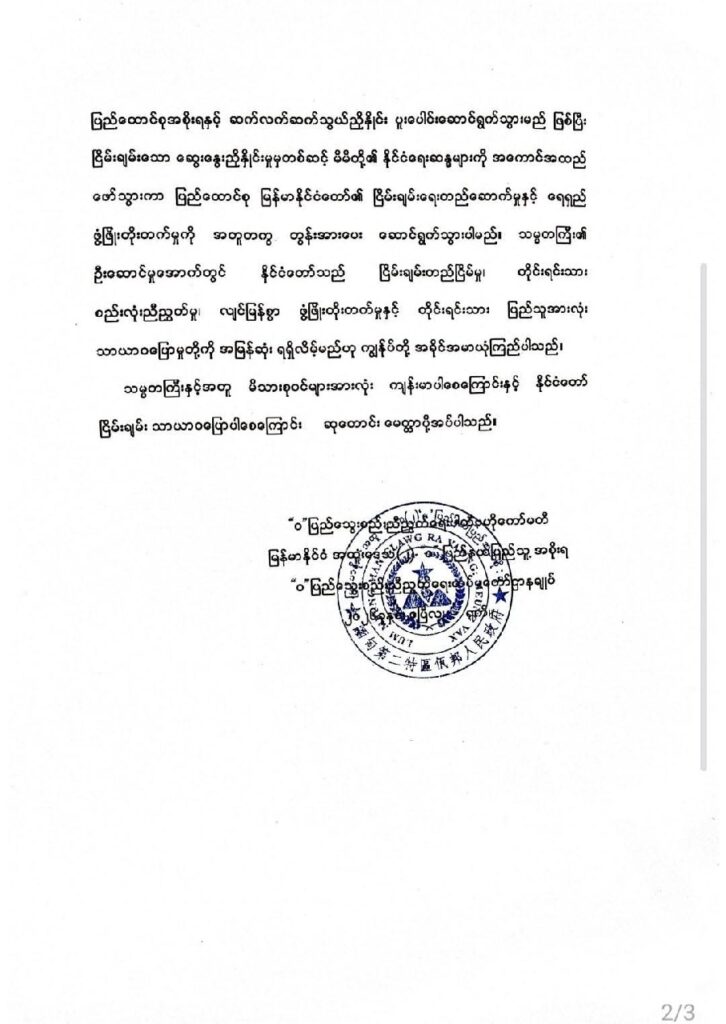 နောက်ပြီး “ ဝ” ပြည်နယ်အနေနဲ့ နယ်စပ်ဒေသ တည်ငြိမ်အေးချမ်းဖို့ ဆက်လက်ထိန်းသိမ်းမှာဖြစ်သလို နိုင်ငံရဲ့ မူဘောင်အောင်မှာ မင်းအောင်လှိုင်အစိုးရနဲ့ ညှိနှိုင်းပူးပေါင်းသွားမှာဖြစ်တယ်လို့ အသိပေးထားပါတယ်။