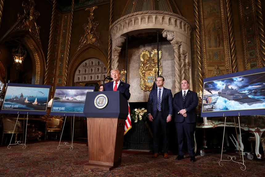 ဖလော်ရီဒါပြည်နယ်၊ မာ-အာ-လာဂို အပန်းဖြေစခန်းတွင် ဒီဇင်ဘာ ၂၂ ရက်နေ့က အမေရိကန်သမ္မတ ဒေါ်နယ်ထရမ့်သည် နိုင်ငံခြားရေးဝန်ကြီး မာကို ရူဘီယို (ဝဲ)၊ စစ်ဝန်ကြီး ပိထ် ဟက်ဆတ် (ယာအလယ်) နှင့် ရေတပ်ဝန်ကြီး ဂျွန် ဖီလန် တို့နှင့်အတူ “ Trump-class” စစ်သင်္ဘောအသစ် တည်ဆောက်မည့်အကြောင်း ကြေညာစဉ်။ (ဓာတ်ပုံ – Tasos Katopodis/Getty Images)(ပုံ)