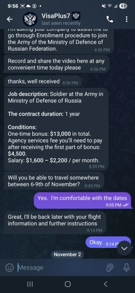 ကတိကဝတ်အနေနှင့် လက်မှတ်ထိုးကြေး ဒေါ်လာ ၁၃,၀၀၀ နှင့် လစာ ဒေါ်လာ ၃,၅၀၀ အထိ ပေးမည်ဟု ကတိပြုခဲ့သော်လည်း လက်တွေ့တွင် လစာမရခြင်း၊ ဘဏ်အကောင့်ထဲမှ ငွေများ ခိုးယူခံရခြင်းနှင့် စာချုပ်ပါအချက်အလက်များကို မိမိနားလည်သည့်ဘာသာသို့ပြန်မပေးဘဲ ရုရှားလိုရေးသားထားသည့်စာချုပ်များကို အတင်းအဓမ္မ လက်မှတ်ထိုးခိုင်းခြင်းများ ရှိနေသည်။