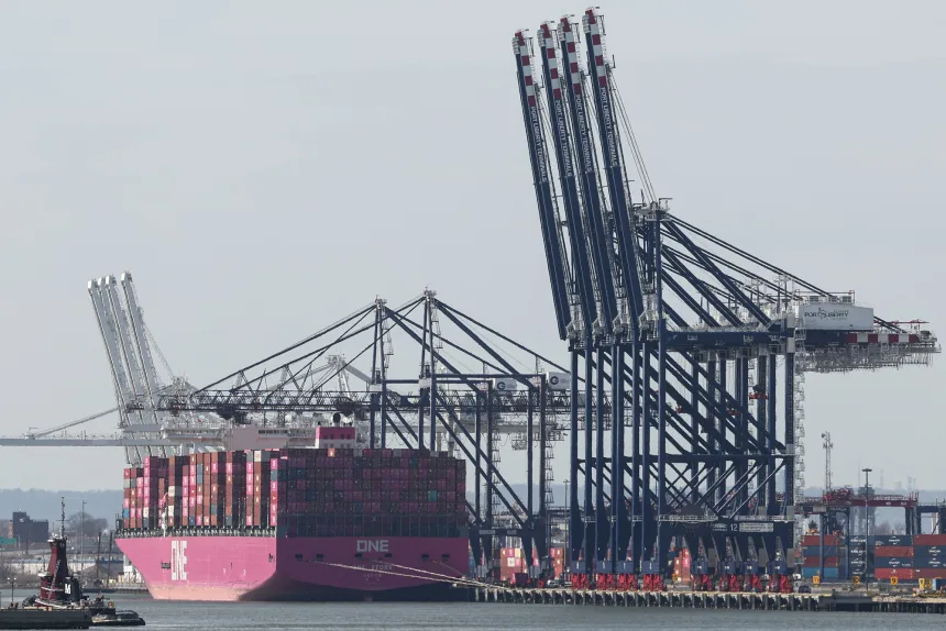 နယူးဂျာစီပြည်နယ်၊ Jersey City ရှိ ဆိပ်ကမ်းတွင် ကုန်သေတ္တာများ တင်ဆောင်ထားသော သင်္ဘောတစ်စီး။ (ဓာတ်ပုံ – Charly Triballeau/AFP/Getty Images)
