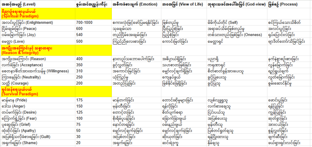 ဒေါက်တာဟော့ကင်းစ်က လူသားရဲ့ အသိစိတ်အဆင့်အတန်း (Map of Consciousness) ကို အဆင့် ၂၀ ကနေ အဆင့် ၇၀၀-၁၀၀၀ အထိ သတ်မှတ်ထားပါတယ်။ အဲ့ဒီအဆင့်တွေကို ပူးတွဲပါ ဇယားကနေ လေ့လာနိုင်ပါတယ်။