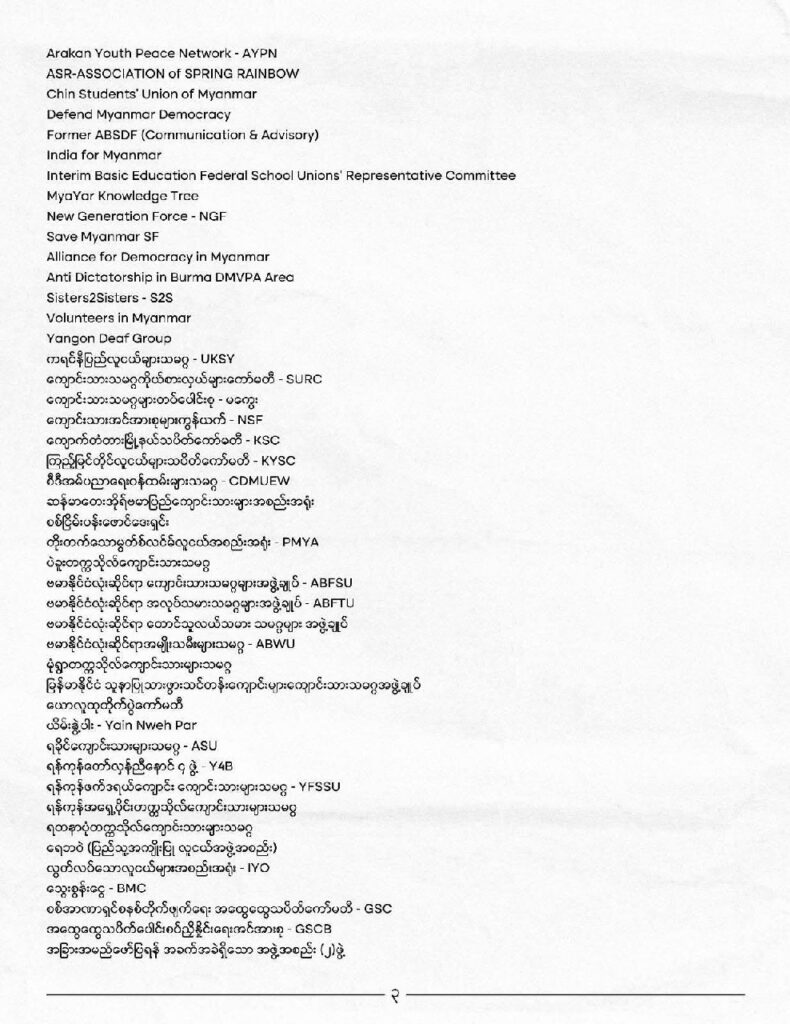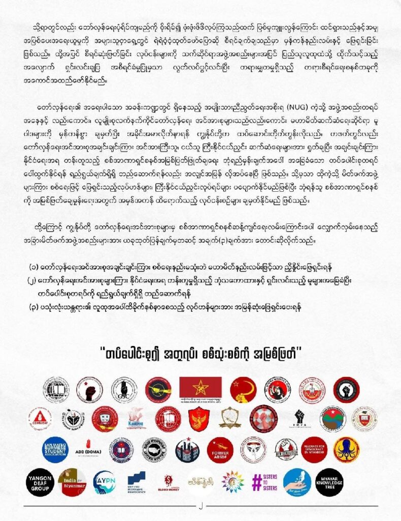 ဒါ့ကြောင့် စစ်အာဏာရှင်စနစ် ဆန့်ကျင်နေတဲ့ တော်လှန်ရေးအင်အားစုအချင်းချင်းကြား စစ်ရေးနည်းမသုံးဘဲ မဟာမိတ်နည်းနဲ့သာ ဖြေရှင်းဖို့ တော်လှန်ရေးအင်အားစုတွေက တောင်းဆိုထားပါတယ်။
