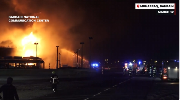 ရေနံကို ပစ်မှတ်ထားတိုက်ခိုက်မှုများ – အီရတ်ရေပိုင်နက်အတွင်းရှိ နိုင်ငံခြား ရေနံတင် သင်္ဘော နှစ်စင်းသည် အီရန်၏ တိုက်ခိုက်မှုကြောင့် မီးလောင်ကျွမ်းခဲ့ရာ အနည်းဆုံး လူတစ်ဦး သေဆုံးပြီး အခြားအမှုထမ်း ၃၈ ဦးကို ကယ်ဆယ်နိုင်ခဲ့သည်။ သီးခြားဖြစ်ရပ်တစ်ခုအဖြစ် အိုမန်နိုင်ငံရှိ လောင်စာဆီသိုလှောင်ရုံတစ်ခုတွင် မီးလောင်မှုကို အရေးပေါ်ကယ်ဆယ်ရေး အဖွဲ့များ ငြှိမ်းသတ်နေကြရသည်။ CNN က တည်နေရာအတည်ပြုထားသည့် လူမှုကွန်ရက် ဗီဒီယိုတစ်ခုတွင် အီရန်ဒရုန်းတစ်စင်းသည် ဆိပ်ကမ်းရှိ ဆီကန်တစ်ခုကို ဝင်တိုက်ခဲ့သည်ကို တွေ့ရသည်။ ထို့ပြင် ဘာရိန်းနိုင်ငံမြောက်ပိုင်းရှိ လောင်စာဆီသိုလှောင်ကန်များကိုလည်း အီရန်က ကြာသပတေးနေ့ ဒေသစံတော်ချိန် အစောပိုင်းတွင် တိုက်ခိုက်ခဲ့ကြောင်း ဘာရိန်းက ပြောကြားခဲ့သည်။