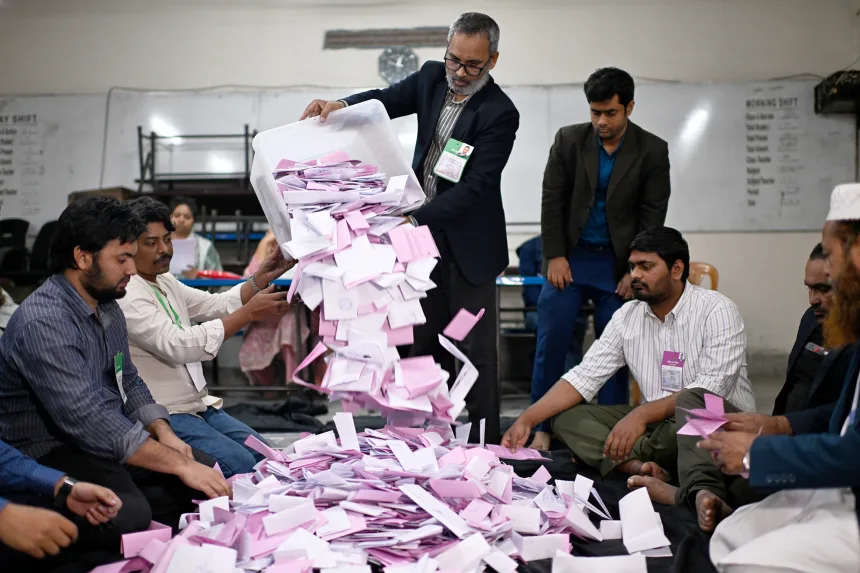 ဘင်္ဂလားဒေ့ရှ်နိုင်ငံ၊ ဒါကာမြို့တွင် ကြာသပတေးနေ့က ကျင်းပခဲ့သည့် အမျိုးသားလွှတ်တော် ရွေးကောက်ပွဲအတွက် ပေးထားသော ဆန္ဒမဲများကို ရွေးကောက်ပွဲ တာဝန်ရှိသူများက စတင်ရေတွက်နေစဉ်။(ပုံ)