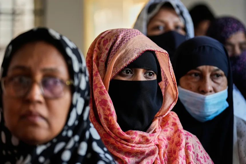 ဘင်္ဂလားဒေ့ရှ်နိုင်ငံ၊ ဒါကာမြို့တွင် ကြာသပတေးနေ့က ကျင်းပသည့် အမျိုးသားလွှတ်တော် ရွေးကောက်ပွဲအတွင်း မဲရုံတစ်ရုံ၌ ဆန္ဒမဲပေးရန်အတွက် ဘင်္ဂလားဒေ့ရှ်အမျိုးသမီးများ တန်းစီစောင့်ဆိုင်းနေကြစဉ်။(ပုံ)