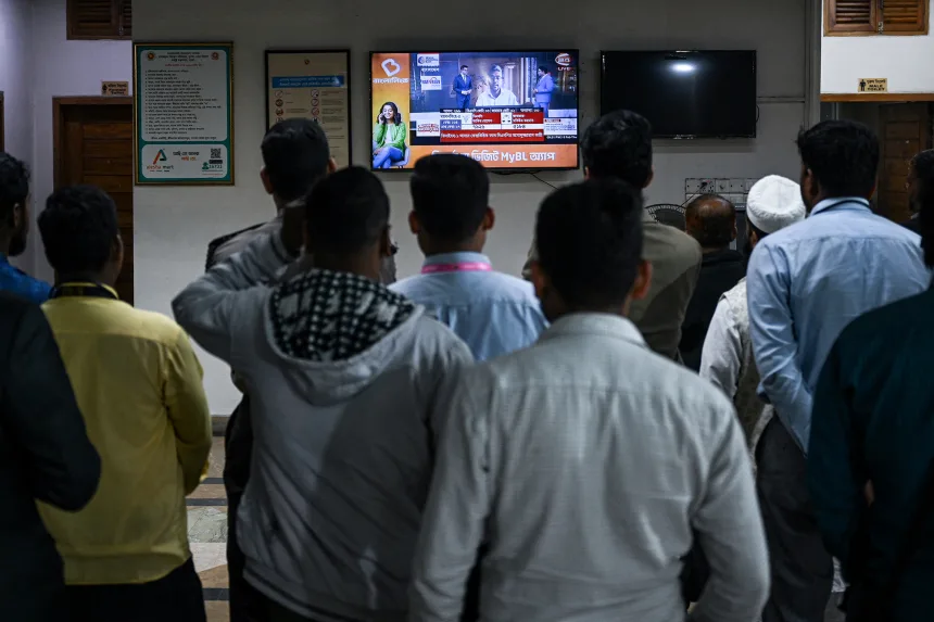 ဘင်္ဂလားဒေ့ရှ်နိုင်ငံ၊ ဒါကာမြို့ရှိ ရွေးကောက်ပွဲကော်မရှင်ရုံးအတွင်း ကြာသပတေးနေ့က ရုပ်မြင်သံကြားဖန်သားပြင်ပေါ်မှ နောက်ဆုံးရ ရွေးကောက်ပွဲရလဒ်များကို ဘင်္ဂလားဒေ့ရှ်ပြည်သူများ စောင့်ကြည့်နေကြစဉ်။(ပုံ)