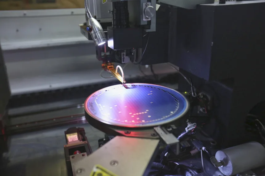 ၂၀၂၆ ခုနှစ်၊ ဇန်နဝါရီလ ၂၈ ရက်နေ့က တရုတ်နိုင်ငံ၊ ပင်းကျိုးမြို့ရှိ Shandong NEM Semiconductor ကုမ္ပဏီတွင် စက်ရုပ်လက်တံတစ်ခုက တစ်ပိုင်းလျှပ်ကူးပစ္စည်း ချစ်ပ်ပြားများကို ထုပ်ပိုးနေစဉ်။ Guo Zhihua/VVCG/Getty Images