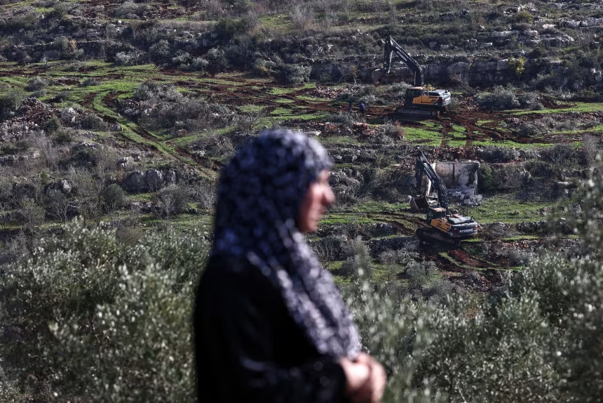 ၂၀၂၅ ခုနှစ်၊ ဒီဇင်ဘာလ ၂၂ ရက်နေ့က သိမ်းပိုက်ထားသော အနောက်ဘက်ကမ်းခြေရှိ စာရော့ဂျ် (Sarouj) နယ်မြေတွင် အခြေချနေထိုင်စခန်းများ ဆောက်လုပ်ရန်အတွက် အစ္စရေးမြေထိုးစက်များက သူမ၏ မြေယာပေါ်တွင် လုပ်ဆောင်နေသည်ကို ပါလက်စတိုင်းအမျိုးသမီးတစ်ဦးက တောင်ကုန်းပေါ်မှ ကြည့်ရှုနေစဉ်။(ပုံ)