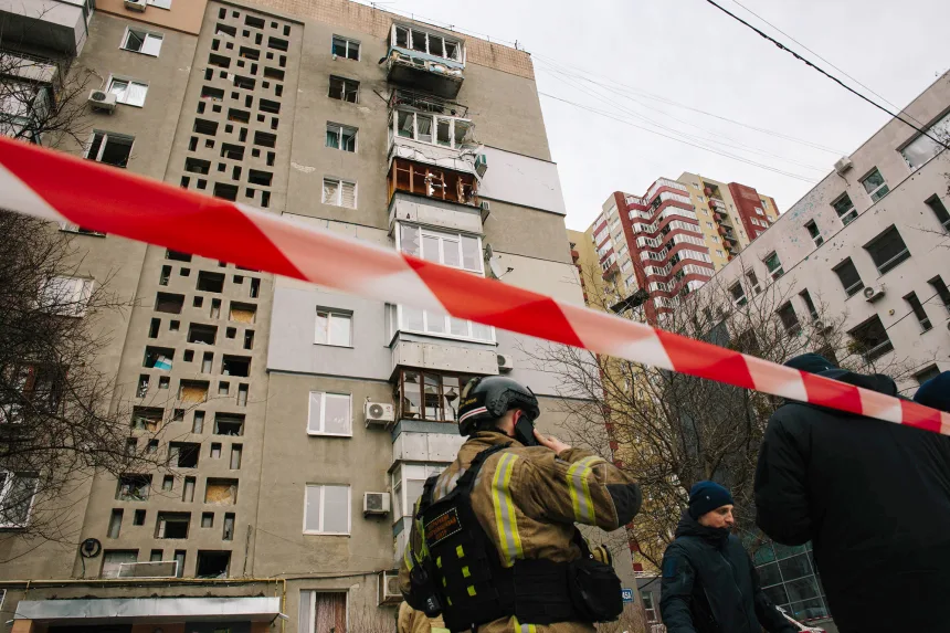မတ်လ ၂ ရက်နေ့က ယူကရိန်းနိုင်ငံ၊ ခါကိဗ်မြို့ရှိ တိုက်ခန်းတစ်ခုကို ရုရှားဒရုန်း တိုက်ခိုက်မှုအပြီး ကယ်ဆယ်ရေးသမားများ လုပ်ဆောင်နေစဉ်။ (ဓာတ်ပုံ – Pavlo Pakhomenko/NurPhoto/Getty Images)
