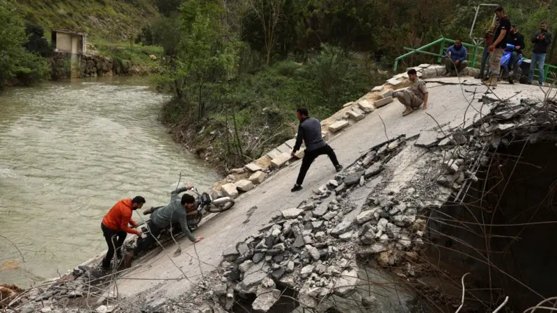 တနင်္ဂနွေနေ့က လက်ဘနွန်နိုင်ငံ ဇရာရီယေး (Zrarieh) ရှိ ပျက်စီးနေသော တံတားတစ်ခုပေါ်သို့ ဆိုင်ကယ်တစ်စီးအား တွန်းတင်နေစဉ် (ပုံ)