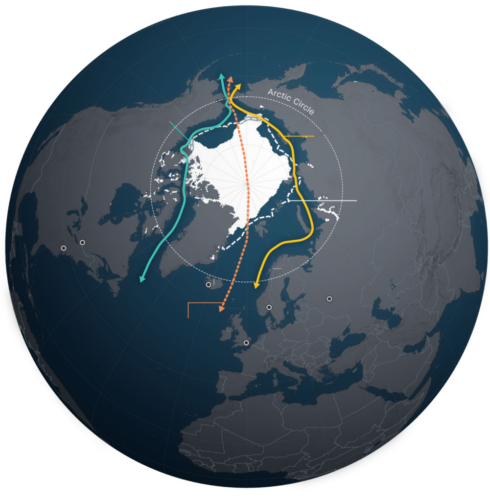 ရုရှားမြောက်ဘက် ကမ်းရိုးတန်းတစ်လျှောက် သွယ်တန်းနေသော မြောက်ဘက်ပင်လယ် လမ်းကြောင်း (Northern Sea Route) နှင့် မြောက်အမေရိက ကမ်းရိုးတန်းတစ်လျှောက်ရှိ မြောက်ဘက်အနောက်ပိုင်း လမ်းကြောင်း (Northwest Passage) တို့သည် ၂၀၀၀ ပြည့်နှစ်များ နှောင်းပိုင်းကတည်းက နွေရာသီ အမြင့်ဆုံးအချိန်များတွင် ရေခဲကင်းစင်လုနီးပါး ဖြစ်နေ ခဲ့သည်။