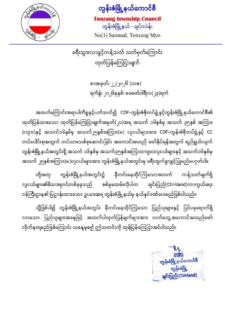 ဒါ့ကြောင့် ချင်းပြည်အစိုးရ ကာကွယ်ရေးဝန်ကြီးဌာနရဲ့ အစည်းအဝေးဆုံးဖြတ်ချက်နဲ့ CDF-တွန်းဇံဇိုတပ်ဖွဲ့ဟာ မြို့နယ်ကောင်စီဦးဆောင်ကော်မတီဝင်တွေရဲ့ ဦးဆောင်မှုနဲ့ တပ်သားသစ်စုဆောင်းမယ်လို့ ဖော်ပြထားပါတယ်။
