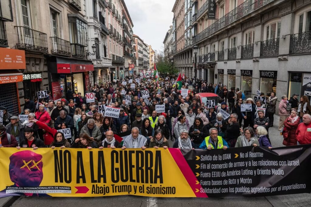 စပိန် – မဒရစ်မြို့ရှိ ဆန္ဒပြသူများသည် မနေ့က ဆန္ဒပြပွဲများတွင် “ စစ်ပွဲကို အလိုမရှိ” နှင့် “ ငြိမ်းချမ်းရေး” ဟု ရေးသားထားသော စာတန်းများကို ကိုင်ဆောင်ခဲ့ကြသည်။ လူအများအပြားသည် ပါလက်စတိုင်း အလံများကိုလည်း ဝှေ့ယမ်းခဲ့ကြသည်။