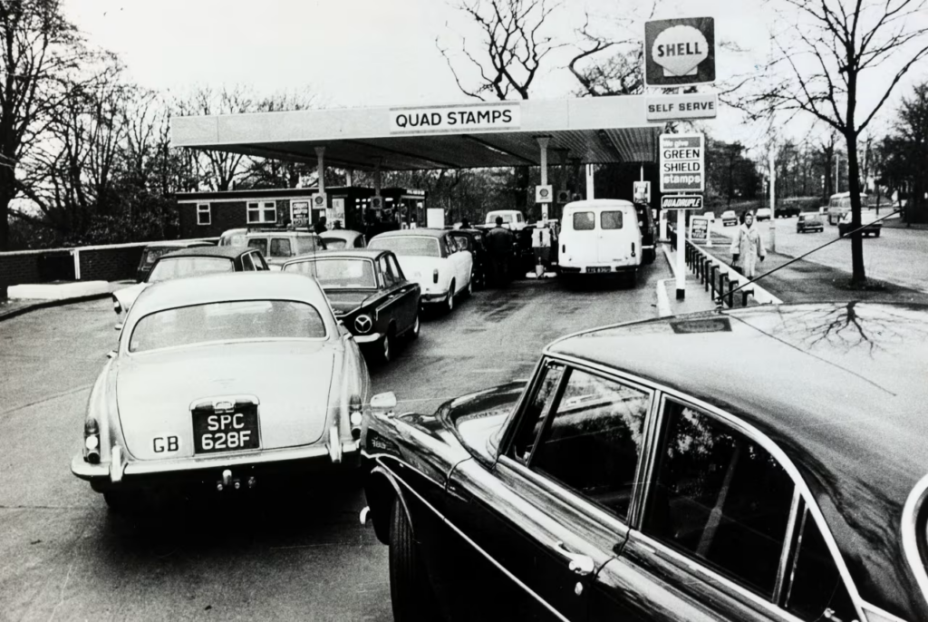 ၁၉၇၃ ခုနှစ် ယူနိုက်တက်ကင်းဒမ်း (UK) တွင် ရေနံအကြပ်အတည်းကာလအတွင်း ဓာတ်ဆီဆိုင်၌ ကားများ တန်းစီနေစဉ်။ Popperfoto/Getty Images