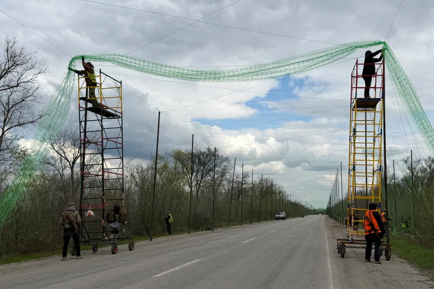 ဧပြီလ ၁၀ ရက်နေ့က ယူကရိန်းနိုင်ငံ၊ Zaporizhia ဒေသရှိ အမည်မဖော်လိုသော နေရာတစ်ခုတွင် ရုရှားဒရုန်းတိုက်ခိုက်မှုများမှ ယာဉ်များကို ကာကွယ်ရန် ယူကရိန်းတပ်ဖွဲ့ဝင်များသည် လမ်းမများကို ပိုက်ကွန်ဖြင့် ဖုံးအုပ်ထားစဉ်။ Darya Nazarova/AFP/Getty Images(ပုံ)