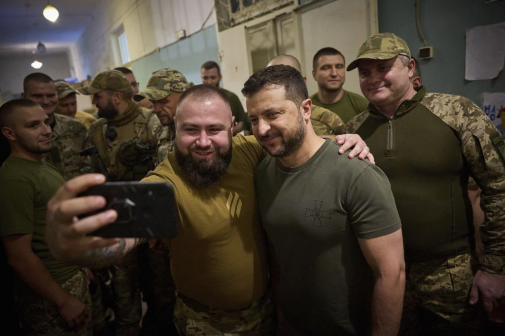 ၂၀၂၃ ခုနှစ်၊ ဩဂုတ်လ ၁၄ ရက်နေ့တွင် ဆိုလီဒါအနီး ရှေ့တန်းရှိ တပ်မဟာဌာနချုပ်သို့ သွားရောက်လည်ပတ်စဉ် ဇယ်လင်စကီးနှင့်စစ်သားများဆယ်လ်ဖီရိုက်နေစဉ်။ ယူကရိန်းသမ္မတရုံး/AP(ပုံ)