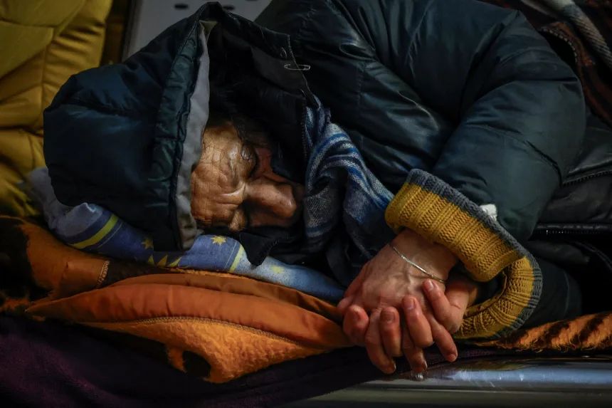 ရုရှား၏ ယူကရိန်းအပေါ် တိုက်ခိုက်မှုများကြား လေကြောင်းရန် သတိပေးချက် ထုတ်ပြန်ထားစဉ် အမျိုးသမီးတစ်ဦးသည် မြေအောက်ဘူတာရုံအတွင်း ခိုလှုံရင်း အိပ်ပျော်နေစဉ်။ Alina Smutko/Reuters (ပုံ)