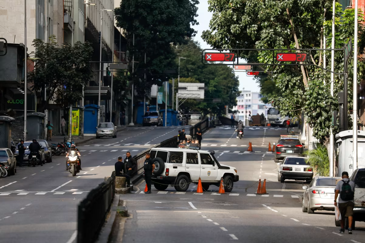 ဇန်နဝါရီလအတွင်း ဗင်နီဇွဲလားနိုင်ငံ၊ ကာရာကပ်စ်မြို့ရှိ Miraflores နန်းတော်သို့ ဦးတည်သည့် လမ်းမပေါ်တွင် ရဲတပ်ဖွဲ့ဝင်များ လုံခြုံရေးယူနေစဉ်။(ပုံ)