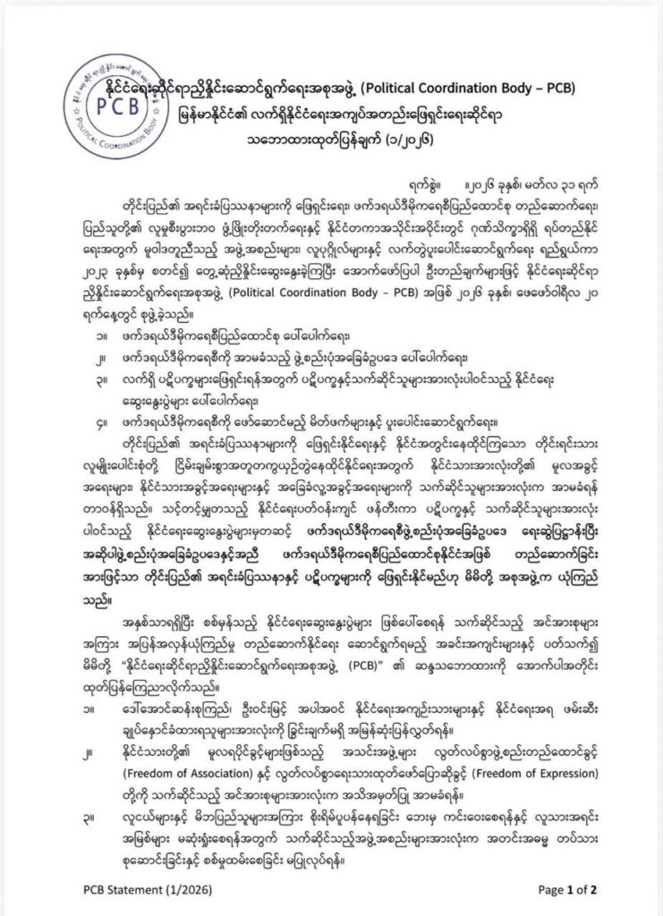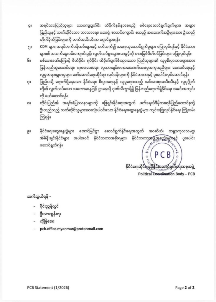 PCB အနေနဲ့ နိုင်ငံရေးဆွေးနွေးပွဲတွေကတဆင့် ဖက်ဒရယ်ဒီမိုကရေစီဖွဲ့စည်းပုံအခြေခံဥပဒေ ရေးဆွဲပြဋ္ဌာန်းပြီး ဖက်ဒရယ်ဒီမိုကရေစီပြည်ထောင်စုနိုင်ငံအနေနဲ့ တည်ဆောက်ပြီးမှသာ ပဋိပက္ခတွေကို ဖြေရှင်းနိုင်မယ်ဆိုတာ ယုံကြည်တယ်လို့ ထုတ်ပြန်ထားချက်အရ သိရပါတယ်။